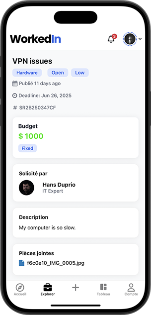 Workedin simplifie et sécurise la gestion de vos besoins informatiques. Fini les appels dans le vide et les interventions improvisées, vous êtes aux commandes.